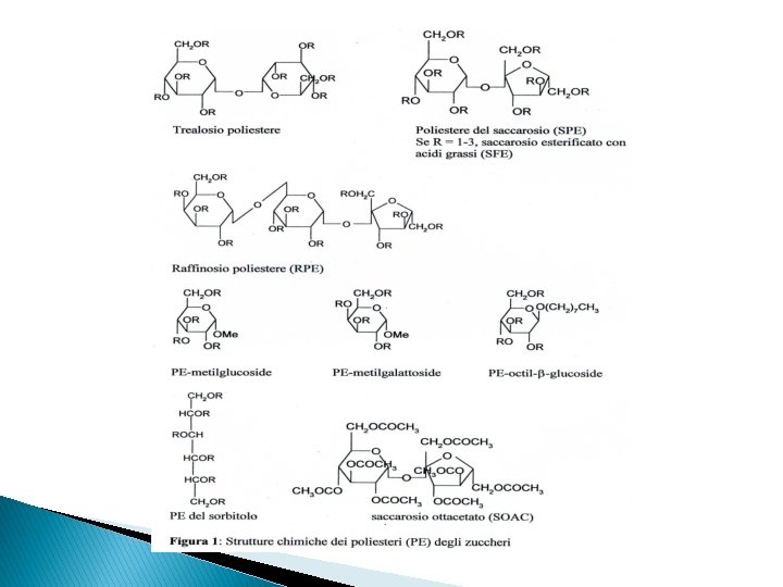 Analoghi dei lipidi Gli analoghi dei lipidi possono essere classificati sulla base della digeribilità e della struttura chimica. Gli esteri del saccarosio sono classificati in base al grado do di sostituzione (D. S. ) ed al bilancio idrofilo-lipofilo (HLB). Le molecole con D. S. 1 -3 (SFE) sono altamente idrofile ed hanno alto HLB (5 -16); le molecole con D. S. >3 (SPE) sono poco idrofili ed hanno HLB basso (2 -6).