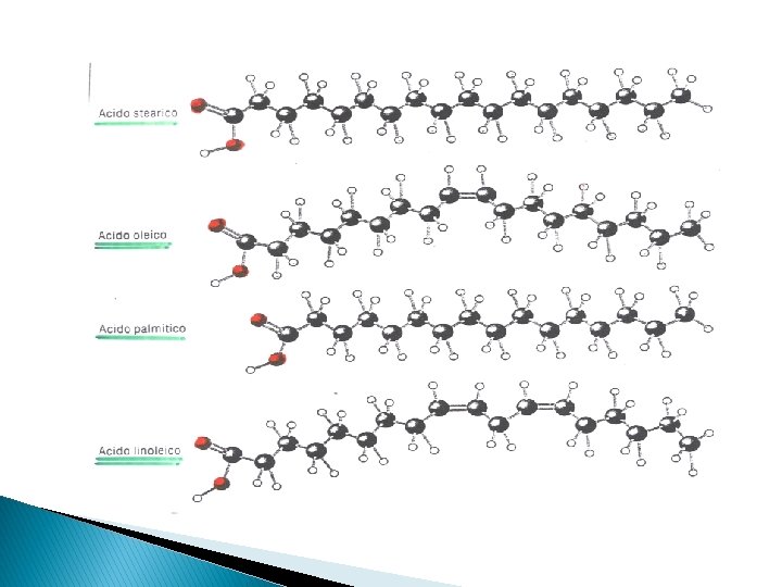 Gli atomi di carbonio vengono numerati da 1 a partire dal gruppo carbossilico verso l’estremità CH 3. Oppure la numerazione può iniziare dal metile; in tal caso si usa indifferentemente la lettera n o Ad esempio � acido linolenico CH 3 -CH 2 -CH=CH-CH 2 -CH=CH-(CH 2 )7 -COOH � n � 18 17 16 15 14 13 12 11 10 9 n-1 n-2 n-3 n-4 n-5 n-6 n-7 n-8 n-9 8 -2 1 n-17 La posizione dei doppi legami può essere segnata in vari modi: - con la numerazione che parte dal gruppo carbossilico si usa con indice il numero che corrisponde al C insaturo ac. linolenico C 18 : 3 9, 12, 15 con la numerazione che parte dal gruppo metilico si usa: la lettera n o seguita dal numero di carbonio interessato al doppio legame - � ac. linolenico C 18 : 3 n-3 oppure C 18 : 3 -3