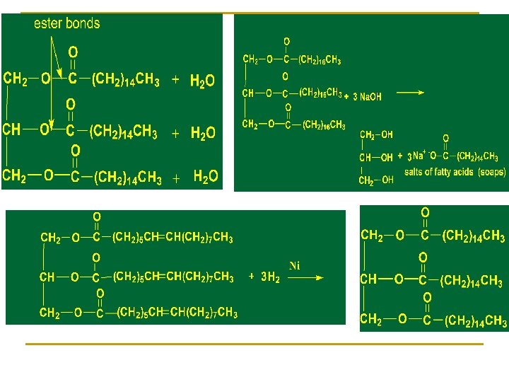 Trigliseridlerin kimyasal özellikleri -Yağlar, ya yüksek basınç altında su ile, ya da normal basınç altında asitlerle kaynatılarak ya da lipaz gibi belirli enzimlerin katalitik etkisiyle hidrolize olurlar; gliserol ve yağ asitlerine parçalanırlar -Yağlar, kuvvetli bazlarla kaynatılırlarsa, sabunlar ve gliserine ayrılırlar. -Yağlardaki yağ asitlerinin doymamış bağları hidrojen ile doyurulabilir ve böylece doymuş yağlar meydana gelir -Yağlar, hava, ışık, rutubet, ısı ve bakteri etkisiyle kendilerine özgü koku ve tatlarını kaybederek acılaşırlar