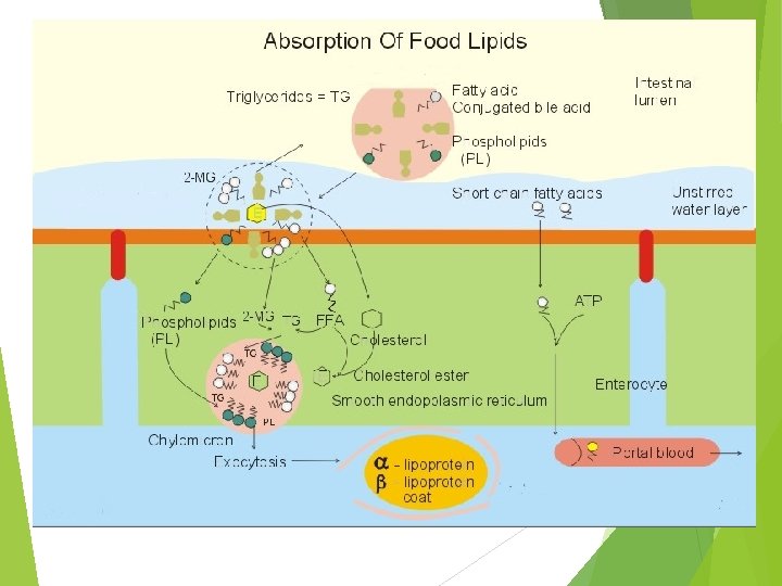 3. Mixed micelle formation Consist mainly of long chain FAs, monoglycerides and bile acids Short (2 -6 C) and medium chain FAs (6 -12 C) are soluble enough in H 2 O that they can be absorbed into the portal blood