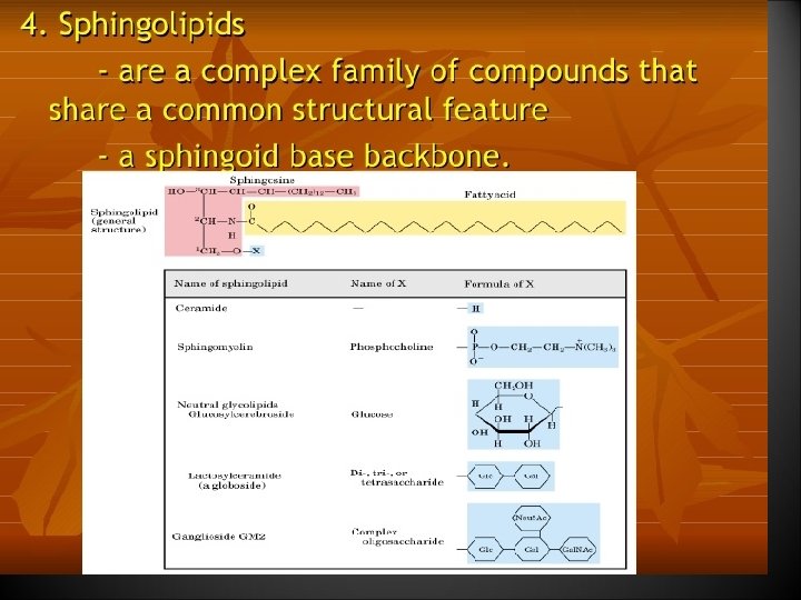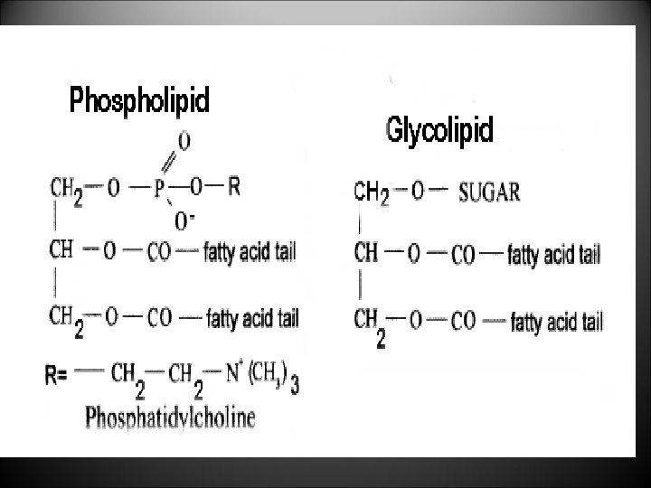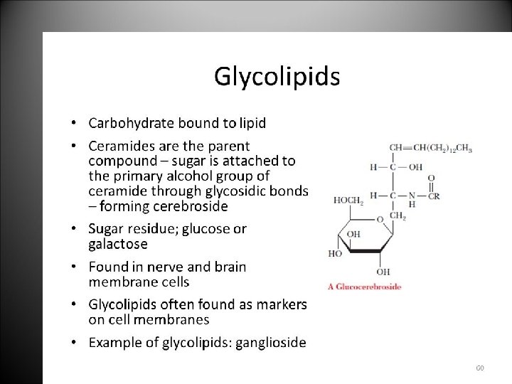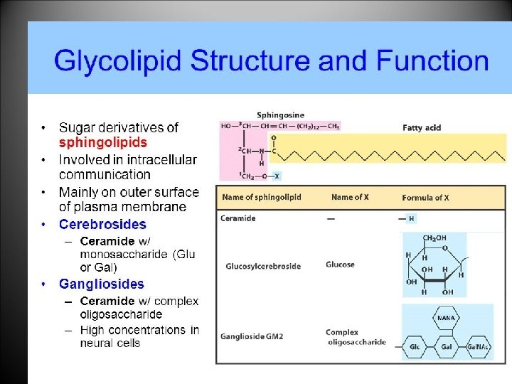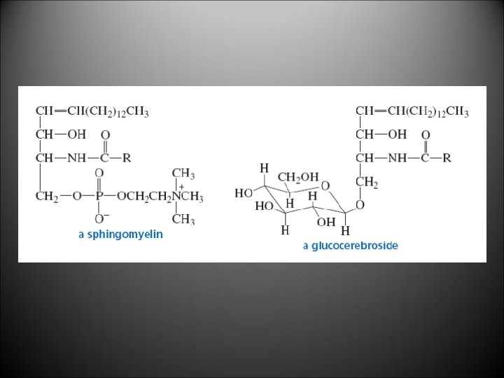• Cerebrosides, the simplest of such carbohydratecontaining lipids, usually have а glucose or galactose as the carbohydrate unit. • Gangliosides contain more complex carbohydrate heads; up to seven monosaccharide units are present. Cerebrosides Gangliosides