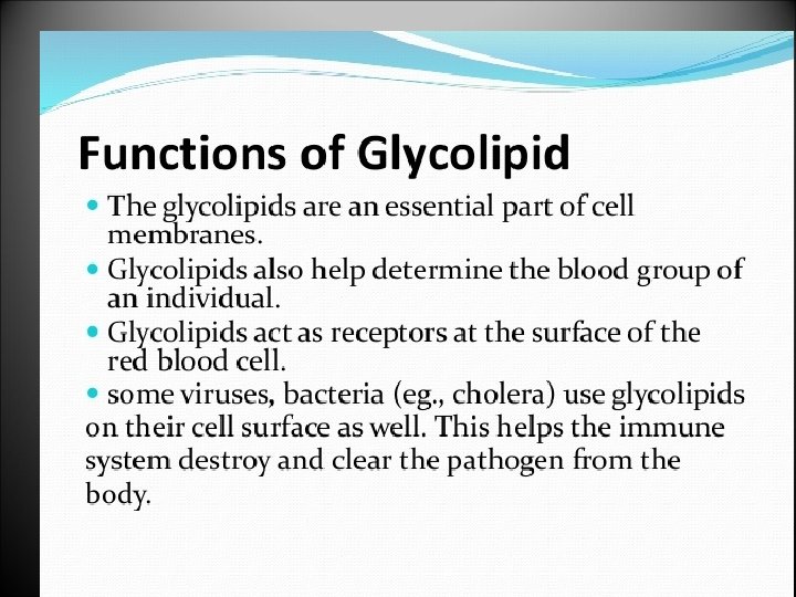 Biological functions • The most important role of lipids is as а fuel. Thus fat is the most concentrated form in which potential energy can be stored. • Since fat is а bad conductor of heat, it provides excellent insulation. • Fat may also provide padding to protect the internal organs. • Some compounds derived from lipids are important building blocks of biologically active materials. • Lipoproteins are constituents of cell walls. • One more important function of dietary lipids is that of supplying the so-called essential fatty acids