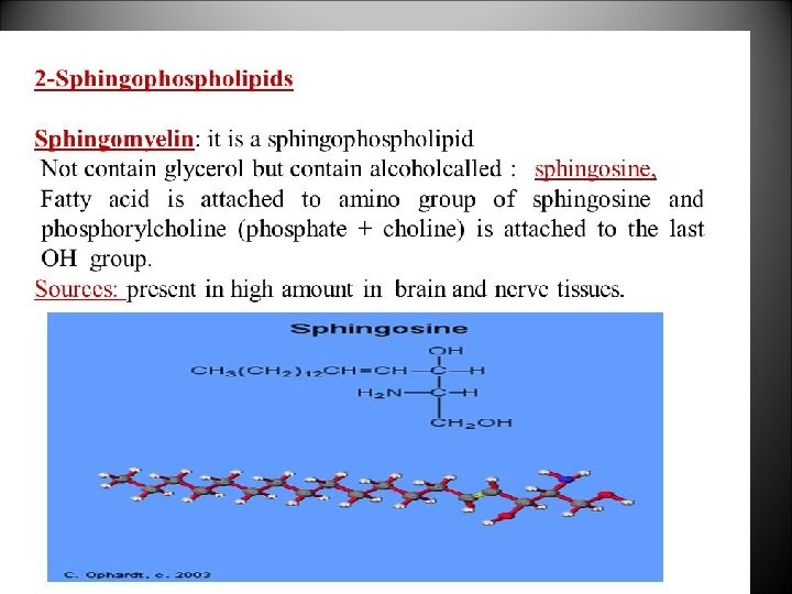Phospholipides • Phosphoacylglycerols are triesters of glycerol in which two -ОН groups are esterified with fatty acids and one third is esterified with phosphofic acid, which in turn is esterified to an alcohol. a)Phosphatidylethanolamines b)Phosphatidylcholines c)Phosphatidylserines • Phosphingolipid are esters of dialcohol sphingosine in which a fatty acid in amide linkage on the amino group and the phosphorylcholine group attached by way of the terminal alcohol group.