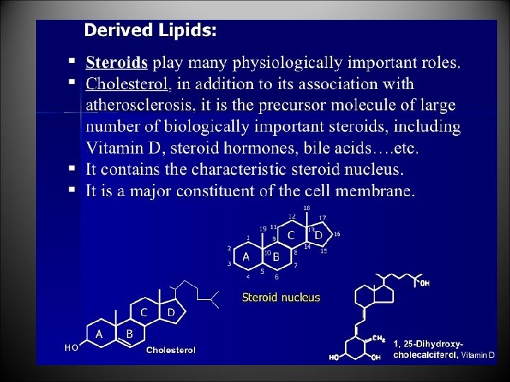• Cholesterol, an unsaturated alcohol whose structure is the most abundant animal steroid. It has been estimated that a 60 kg person has a total of about 175 g of cholesterol distributed throughout the body. Much of this cholesterol is bonded through ester links to fatty acids, but some is found as the free alcohol. Gallstones, for example, are nearly purecholesterol. • Cholesterol serves two important functions in the body. First, it is a minor component of cell membranes, where it helps to keep the membranes fluid. Second, it serves as the body’s starting material for the synthesis of all other steroids, including the sex hormones.