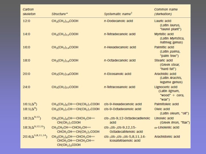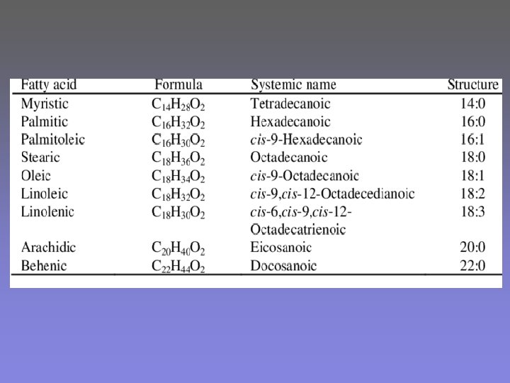 saturated Fatty Acids Fatty Acid # of Carbons # of C=C lauric 12 0 myristic 14 0 palmitic 16 0 stearic 18 0