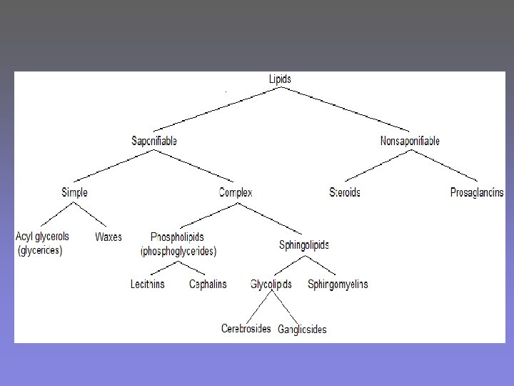 Classification By structure: 1. Simple: fats, oils, waxes, steroids. 2. Complex: phospholipids, sphingolipids, glycolipids. 3. Derived lipids: hormones, fat-solubility vitamins