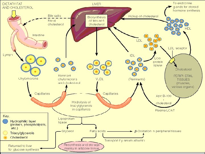 Type of plasma lipoproteins • There are 4 major classes of plasma lipoproteins: – Chylomicrons carry dietary triglycerides from intestines to other tissues – VLDL (very low density lipoproteins) carry triglycerides from liver – LDL (low density lipoproteins) carry cholesterol to peripheral tissues and is, therefore, known as bad cholesterol – HDL (high density lipoproteins) carry cholesterol peripheral tissues to liver and this is why it is known as good cholesterol