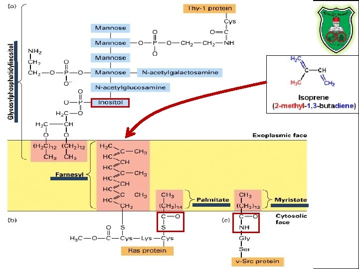 Lipid-anchored membrane proteins • Four types have been found: – Amide-linked myristoyl anchors • Always myristic acid – Thioester-linked fatty acyl anchors • myristate, palmitate, stearate, oleate – Thioether-linked prenyl anchors • Prenylation refers to linking of "isoprene"-based groups – Glycosyl phosphatidylinositol anchors • Ethanolamine link to an oligosaccharide linked in turn to inositol of PI