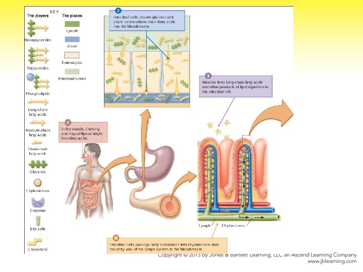 Lipid Digestion and Absorption – Mouth • Chewing + lingual lipase – Stomach • Triglycerides to diglycerides and free fatty acids (FFA) – Small intestine • Emulsified by Bile • Digested by pancreatic lipase