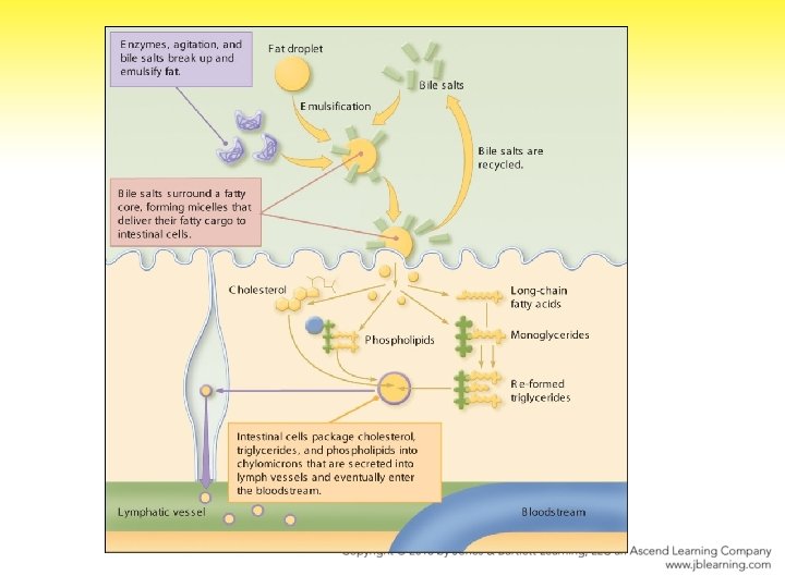 • Lipid absorption – Micelles • Carry monoglycerides and fatty acids to microvilli • Bile salts absorbed = enterohepatic circulation • Lipoprotein • Cylomicron – Deliver dietary lipids from intestines to cells and liver