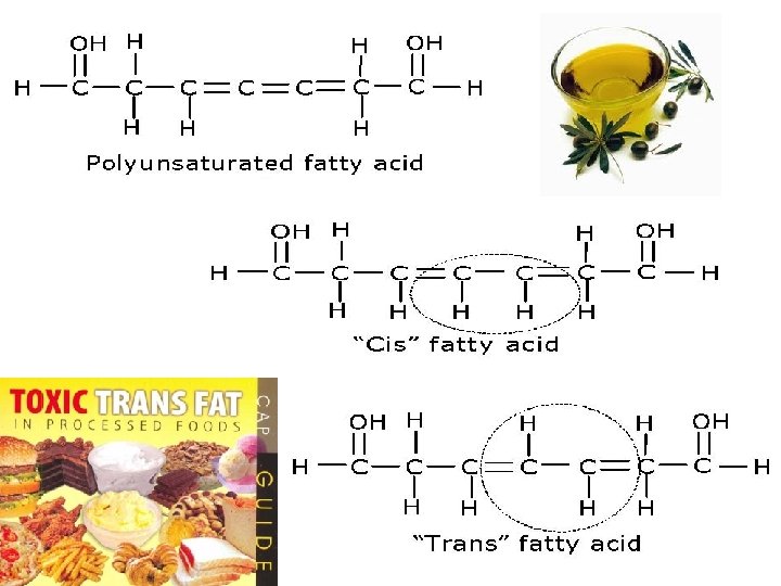 Unsaturated fats • C=C double bonds in the fatty acids – plant & fish fats – vegetable oils – liquid at room temperature • the kinks made by double bonded C prevent the molecules from packing tightly together mono-unsaturated? poly-unsaturated?