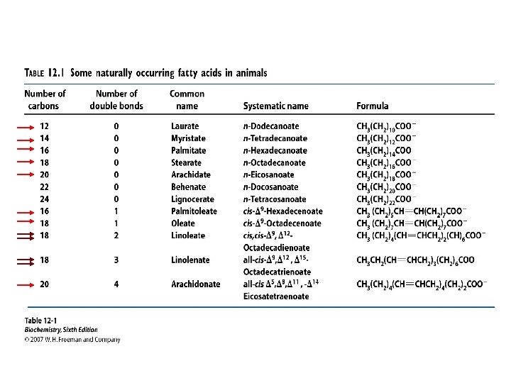 Fatty acids v. Fatty acids (FAs) consist of hydrocarbon chain with a carboxylic acid at one end straight-chain organic acids v. Most naturally occurring fatty acids have an even number of carbon atoms v. They can be saturated and unsaturated. v. Unsaturated fatty acids have lower melting points than saturated fatty acid.