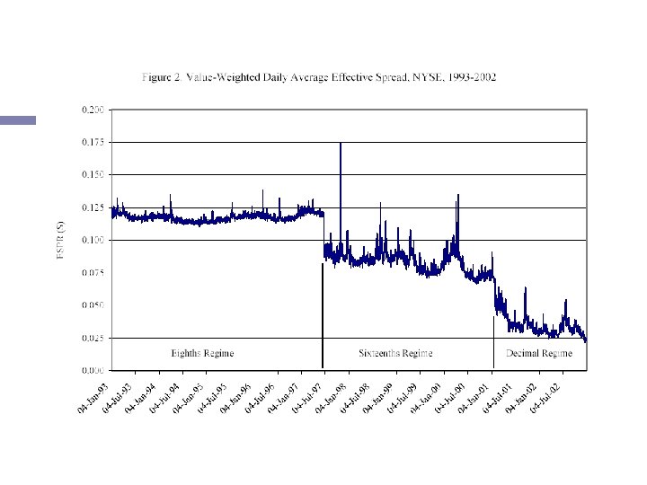 Efficiency over time n Secular decrease in bid-ask spreads across the three tick regimes n How did this affect efficiency? n How does efficiency vary within the day?
