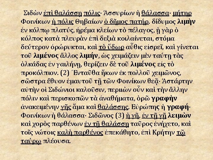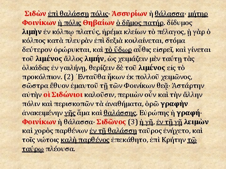 • Les élèves constatent que certains éléments donnent des indications géographiques, « réalistes » (rouge) : – Noms propres : Sidon (recherche : ville de Phénicie), Assyriens (recherche), Phéniciens, Thébains. – Eléments concernant les noms propres : θαλάσσῃ, πόλις, θάλασσα, μήτηρ, πόλις, ὁ δῆμος, πατήρ —tous termes connus des élèves (la première ligne est compréhensible à la lecture). – Autres éléments géographiques : • • θάλασσα, ὕδωρ, γῆ… On peut donner πέλαγος qu’ils ne connaissent pas encore, mais qui sera très employé pour la description du Nil. λιμὴν, τοῦ λιμένος, λιμήν, τοῦ λιμένος et à partir du § 3, λειμὼν, ὁ λειμών, τὸν λειμῶνα, ὁ λειμὼν, τοῦ λειμῶνος… Deux termes très récurrents. Questions : Sens ? Même famille ? (à vérifier à la lecture du français —occasion de rappeler la 3 e déclinaison, à travers des termes qui, ayant été l’objet d’un questionnement, seront ensuite facilement mémorisés).
