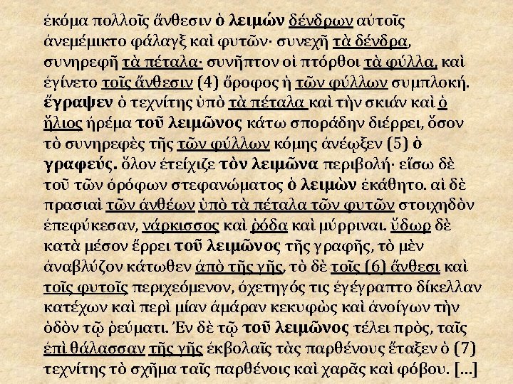 • Les élèves repèrent un champ lexical de la nature (d’une nature raffinée —avec les noms de fleurs). – Ils connaissent (ou devinent) : δένδρων, (τὰ δένδρα), φυτῶν, πέταλα (traduction approximative), τὰ φύλλα (τῶν φύλλων), νάρκισσος καὶ ῥόδα + ὕδωρ. – On peut leur donner τοῖς ἄνθεσιν pour compléter (en évoquant « anthologie » ). – Ils en déduisent (un peu à tort… que λειμών désigne un jardin — occasion plus tard, dans la deuxième ekphrasis, de découvrir le terme « jardin » : παραδεῖσος…). • Ils peuvent aussi repérer des termes désignant des vêtements, des parties du corps… • Le terme βοός revient régulièrement en plus de ταῦρος…