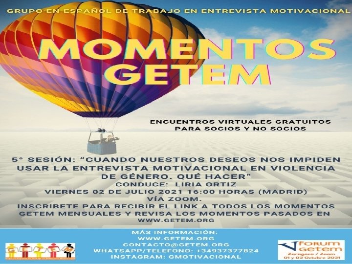 Liria Ortiz Psicóloga, doble master y especialista en Psicología Clínica. Escribe, da cursos y conferencias en Entrevista Motivacional (EM) adaptada al condumo problemático de substancias así como al juego patológico, la violencia doméstica y autismo. Es entrenadora certificada en EM, por la red internacional de formadores MINT, (Motivational Interviewing Network of Trainers) E-mail: liria. ortiz@gmail. com Página web: www. liriaortiz. com Puedes seguirla por Facebook, Linked. In, Instagram y Youtube. Twitter: @Psykolog. Liria