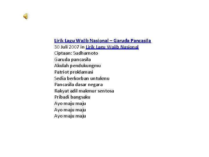 Lirik Lagu Wajib Nasional – Garuda Pancasila 30 Juli 2007 in Lirik Lagu Wajib Nasional Ciptaan: Sudharnoto Garuda pancasila Akulah pendukungmu Patriot proklamasi Sedia berkorban untukmu Pancasila dasar negara Rakyat adil makmur sentosa Pribadi bangsaku Ayo maju Ayo maju