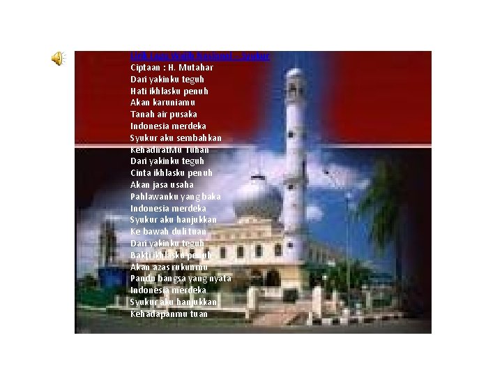 Lirik Lagu Wajib Nasional – Syukur Ciptaan : H. Mutahar Dari yakinku teguh Hati ikhlasku penuh Akan karuniamu Tanah air pusaka Indonesia merdeka Syukur aku sembahkan Kehadirat. Mu Tuhan Dari yakinku teguh Cinta ikhlasku penuh Akan jasa usaha Pahlawanku yang baka Indonesia merdeka Syukur aku hanjukkan Ke bawah duli tuan Dari yakinku teguh Bakti ikhlasku penuh Akan azas rukunmu Pandu bangsa yang nyata Indonesia merdeka Syukur aku hanjukkan Kehadapanmu tuan