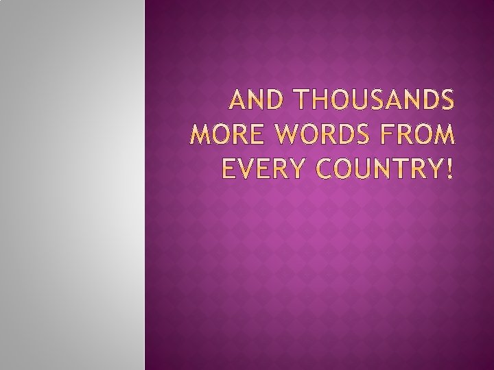 � German settlers brought “noodle”, “pretzel”, “kindergarten” � Dutch settlers brought “stoop”, “golf”, “wagon” � French settlers brought “chowder”, “prairie”, “toboggan” � Spanish settlers brought “canyon”, ranch” “alligator”