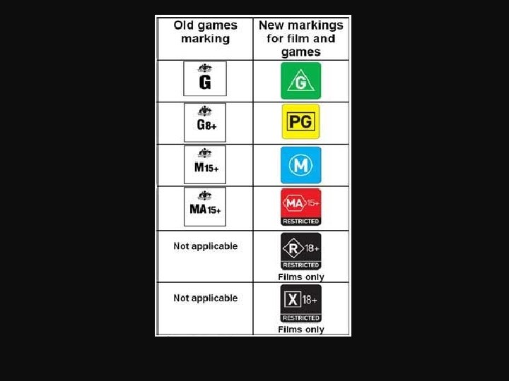 Media Guidelines As a result, there has been a push to restrict videogame sales nationally. Australia however is an interesting case as restriction laws are quite lax. Did you know that there are no R 18+ rating systems within Australia for videogames as it only applies to movies. This means that games are allowed if they are edited to conform to an MA 15+ standard or they are refused classification [RC] (1)