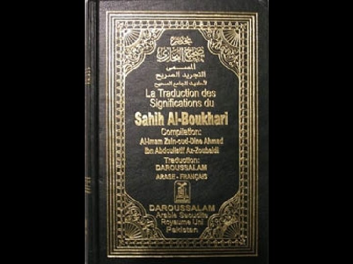 • Les Hadith: • faits et paroles du prophète (y compris des révélations divines) rapportés oralement par les compagnons de Mohammed et fixés par écrit un siècle après le Coran. C'est là que nous sont rapportés les enseignements de Mohammed donnés à divers disciples, ses réponses à diverses questions précises, les détails de sa vie familiale etc. • Mohammed n'a rien écrit de lui-même, nous devons donc passer obligatoirement par le témoignage de ces hommes, qui furent des compagnons fidèles de celui qu'ils appelaient "l'Envoyé de Dieu » . • Parmi les Hadith, seuls ceux du Sahih de El-Bokhâri sont considérés unanimement par les hautes autorités islamiques comme les plus authentiques paroles et faits du prophète Mohammed, et ils se placent juste après le Coran dans l'ordre d'importance, de véracité,