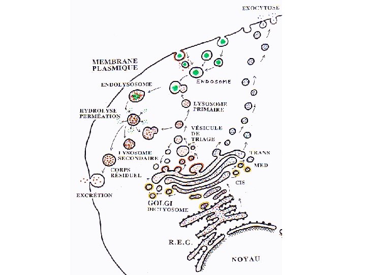LISOSOMII • Sunt inconjurati de membrana simpla 0. 2 -1 • Enzimele lisosomale sunt aproximativ 50 pentru diferite substrate: » Pentru acizii nucleici: ribonucleaze acide ; dezoxiribonucleaz acide. » Pentru esteri fosforici: prin fosfataza acidă enzima marker. » Pentru proteine : catepsina; colagenaza » Pentru glicogen : -glicozidaza » Pentru mucopolizaharidaze: -manozidaza, -galactozidaza, -glucoronidaza • Enzimele au un p. H acid. • Sunt inactive daca membrana lisosomilor este intacta