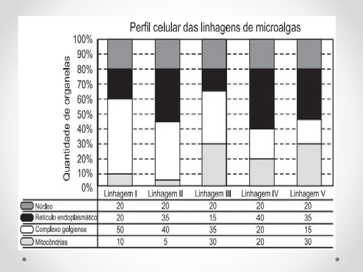 (ENEM 2013) Uma indústria está escolhendo uma linhagem de microalgas que otimize a secreção de polímeros comestíveis, os quais são obtidos do meio de cultura de crescimento. Na figura podem ser observadas as proporções de algumas organelas presentes no citoplasma de cada linhagem. Qual é a melhor linhagem para se conseguir maior rendimento de polímeros secretados no meio de cultura? A) I B) II C) III D) IV E) V
