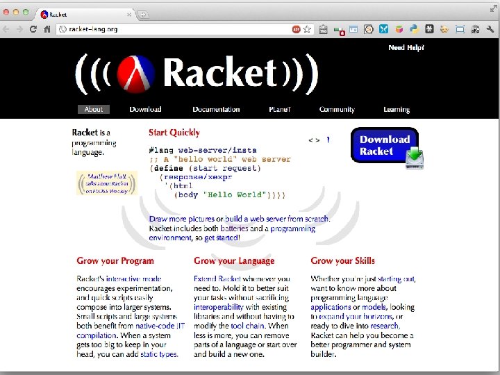 �Scheme • Scheme is a dialect of Lisp that is favored by people who teach and study programming languages – It's simpler and more elegant than Lisp – It's pioneered many new programming language ideas (e. g. , continuations, call/cc) – It's influenced Lisp (e. g. , adoption of lexical scoping of variables) – It's still evolving, so it's a good vehicle for new ideas