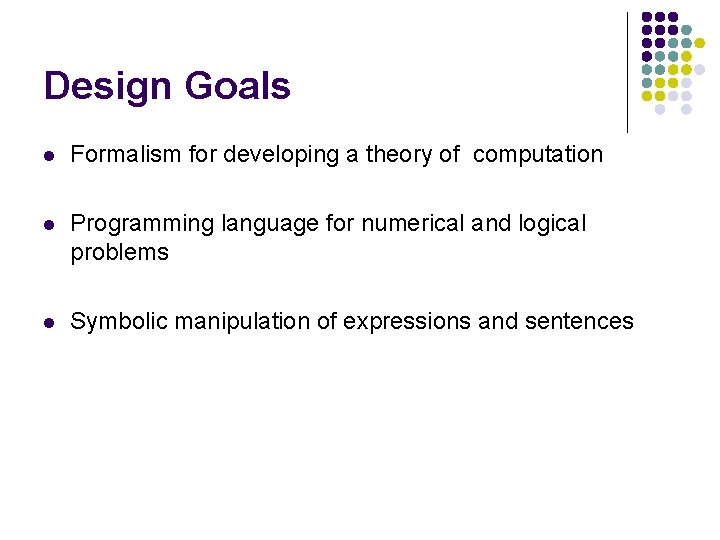 Design Goals l Formalism for developing a theory of computation l Programming language for numerical and logical problems l Symbolic manipulation of expressions and sentences
