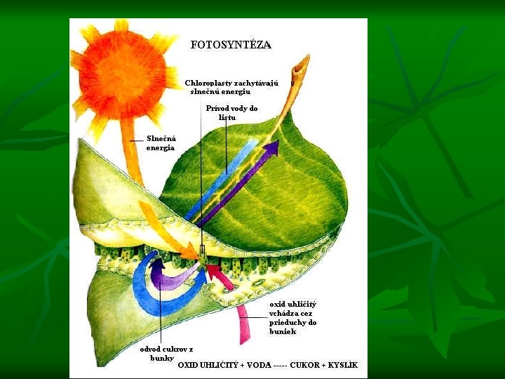 Fotosyntéza n n fotosyntéza prebieha v listoch: je to premena anorganických látok na organické látky (anorganické látky)oxid uhličitý + voda chlorofyl (organické látky ) slnečná energia cukor + kyslík