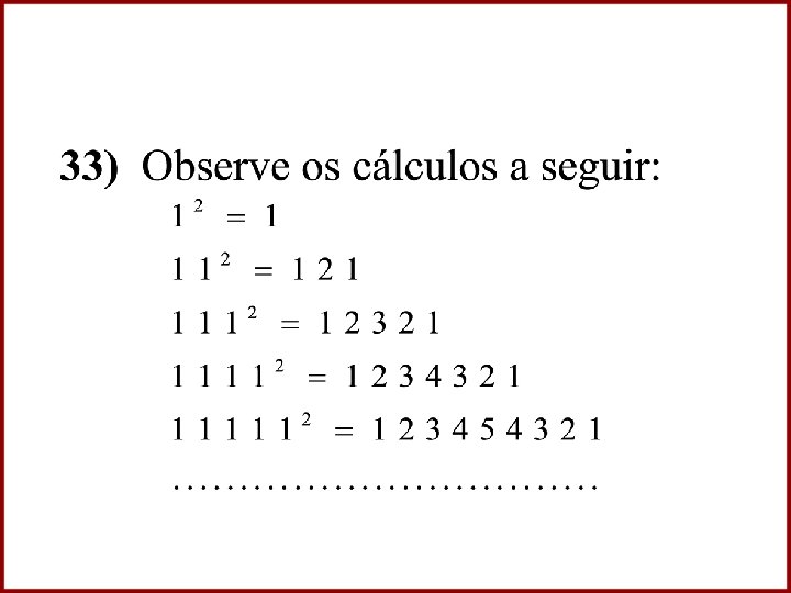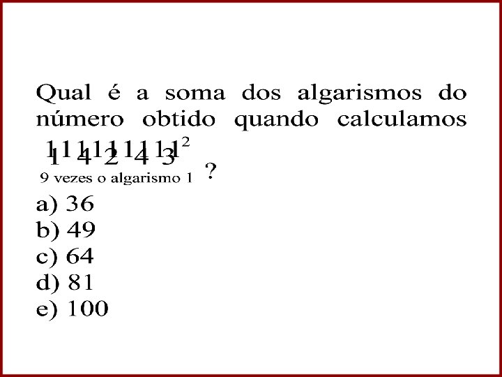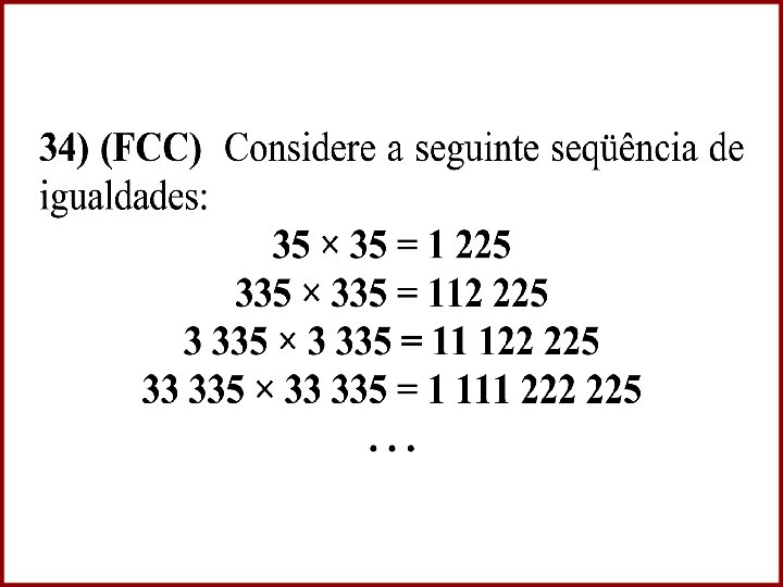 • Com base na análise dos termos dessa seqüência, é correto afirmar que a soma dos algarismos do produto 33333335× 33333335 é • (A) 28 • (B) 29 • (C) 30 • (D) 31 • (E) 33