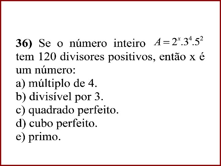 • 1) Quantos divisores positivos possui o número 72? • a) 8 • b) 12 • c) 14 • d) 20 • e) 36
