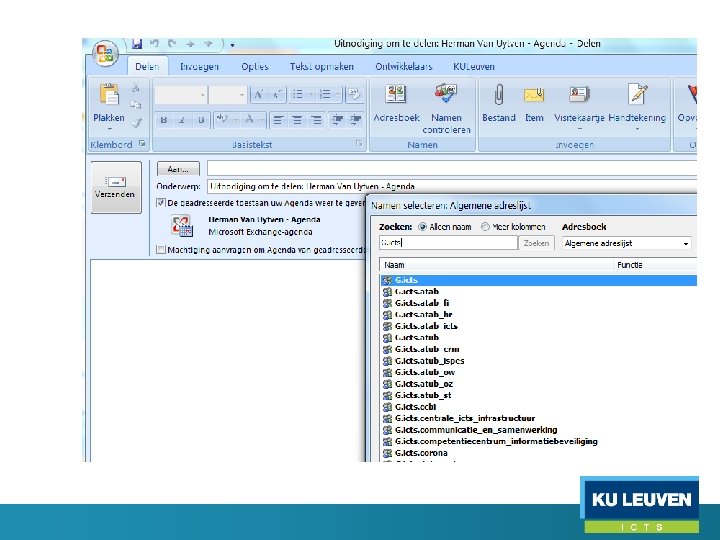 Groepentoepassing • AD groepen o o Delen van agenda’s Groepen binnen Share. Point AD groepen kunnen ‘mail enabled’ worden, maar hebben minder mogelijkheden dan listserv (vooral indien men geen Outlook of OWA gebruikt, of externen wil opnemen) -> listserv primaire tool voor mailinglijsten