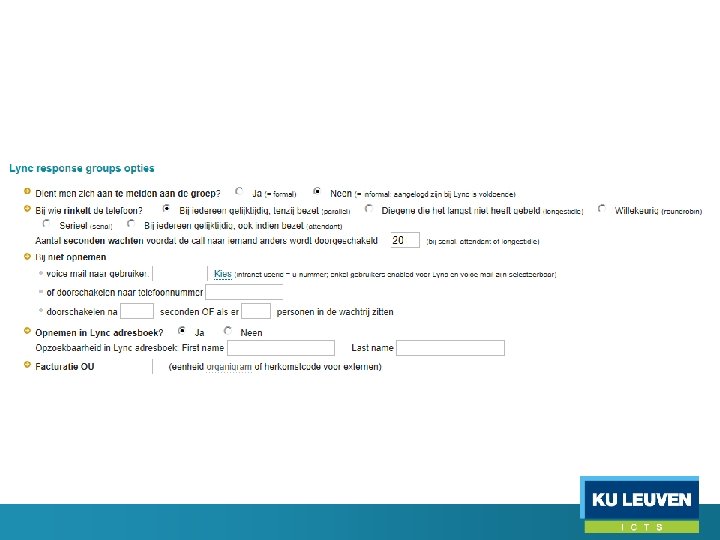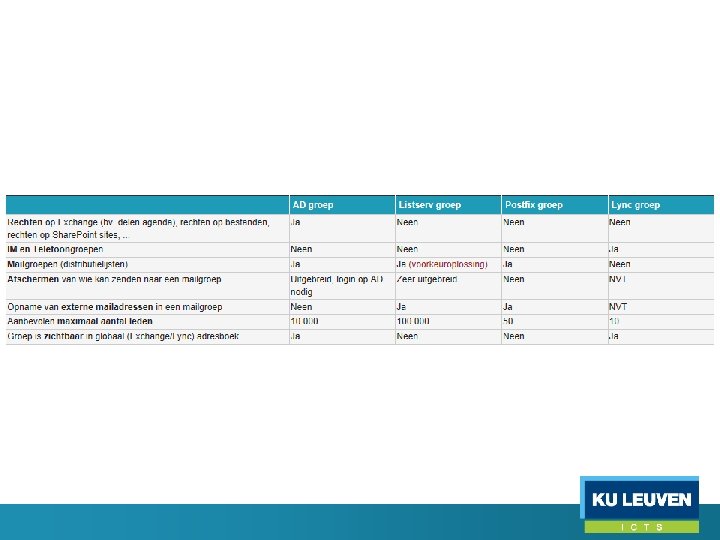 Aanvraag van een groep • KU Leuven personeel kan zelf een listserv groep aanvragen; goedkeuring nodig door ICTS fooces-comsam • AD, postfix en Lync groepen dienen altijd eerst door ICTS fooces-comsam aangemaakt te worden