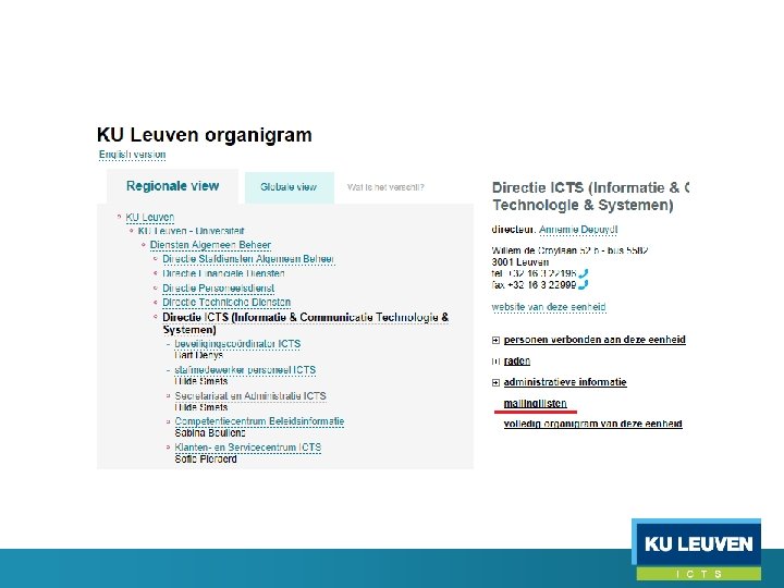 Groepentoepassing URL’s • https: //cwisdb. kuleuven. be/persdb-bbin/groepen • Lijst van mailinglijsten per eenheid: op te zoeken via het organigram o http: //www. kuleuven. be/wieiswie/nl/unit/50000050 (enkel KU Leuven) o https: //cwisdb. kuleuven. be/organigram/ (organigram gebruikt voor mailadministratie; associatiebreed) Exchange/groepentoepassing = KU Leuven + Luca + TM *3