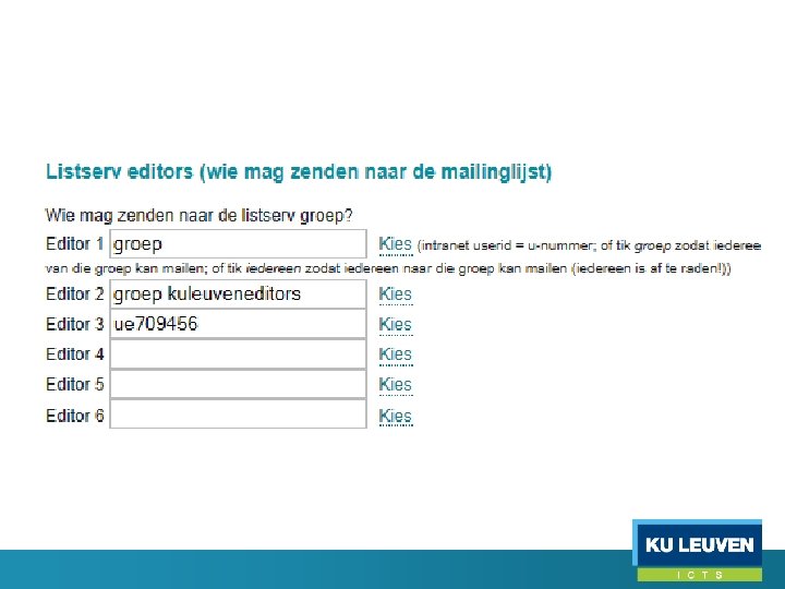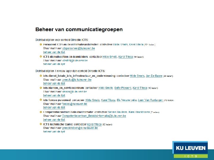 Groepentoepassing • Listserv groepen o o o Te beheren via groepentoepassing, niet via listserv Groepen starten op listserv altijd met ‘groep’, bv. groepitbeheerders@ls. kuleuven. be Alias zoals itbeheerders@kuleuven. be kan verwijzen naar de lijst