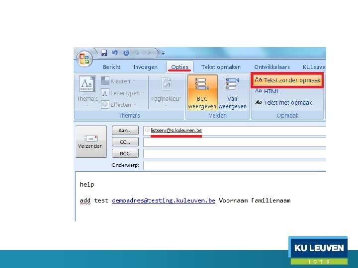 Mail naar listserv <-> lijst • Commando’s voor listserv (subscribe / unsubscribe / …) => mail naar listserv@ls. kuleuven. be • Mail (bijdrage) sturen naar een lijst => mail naar lijstnaam@ls. kuleuven. be