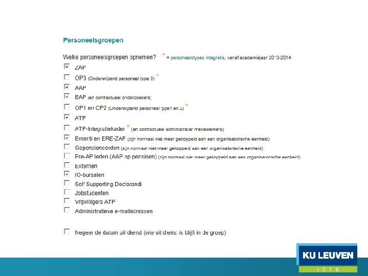 Admin opties (opties die enkel door ICTS fooces-comsam kunnen aangepast worden) • Query op studentendatabank (enkel KU Leuven studenten) • Confirmatie afzetten bij mailinglijsten • Personen uit dienst in de groep laten