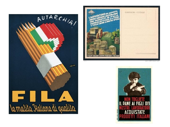 LA POLITICA ECONOMICA (2) � 1933: fondazione dell’IRI (Istituto per la Ricostruzione Industriale) per salvare le aziende chiedevano aiuto allo stato. � 1934: istituzione delle corporazioni, associazioni professionali controllate dallo stato (i sindacati erano stati aboliti) che riuniscono sia lavoratori che datori di lavoro i lavoratori perdono forza contrattuale. � 1935: autarchia dopo le sanzioni inflitte all’Italia dalla Società delle Nazioni come punizione per la guerra in Etiopia incentivata la produzione nazionale, molti prodotti di importazione sostituiti da surrogati. Penalizzate le piccole imprese che non riescono più ad esportare i propri prodotti.
