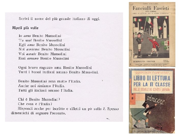 Le organizzazioni giovanili Tutti i bambini dai 6 agli 8 anni erano figli della lupa, poi i maschi diventavano balilla (8 -14 anni) e avanguardisti (14 -18), mentre le femmine diventano piccole italiane e giovani italiane. Ragazzi e ragazze dovevano partecipare alle parate, in divisa, e allenarsi con esercizi ginnici. I maschi venivano anche preparati fin da piccoli alla guerra (uno dei motti fascisti era “Libro e moschetto, fascista perfetto”). Nella foto, alcuni balilla moschettieri.