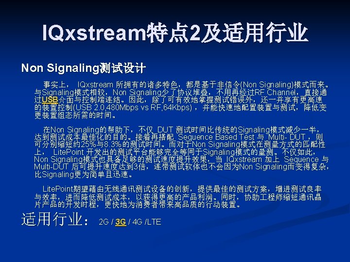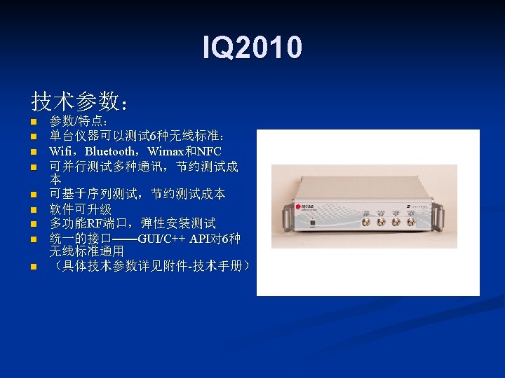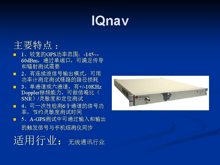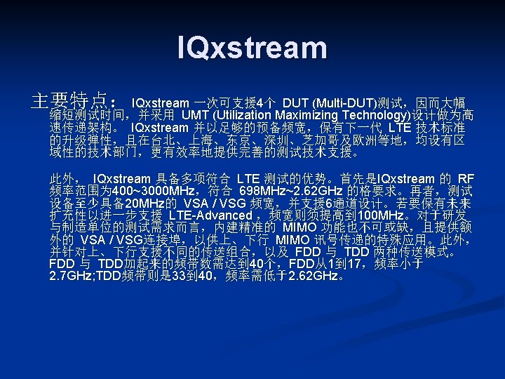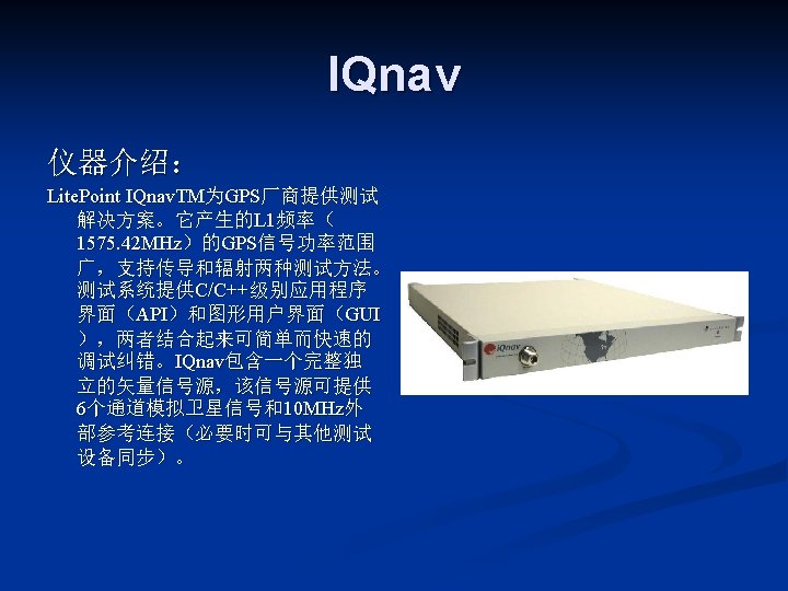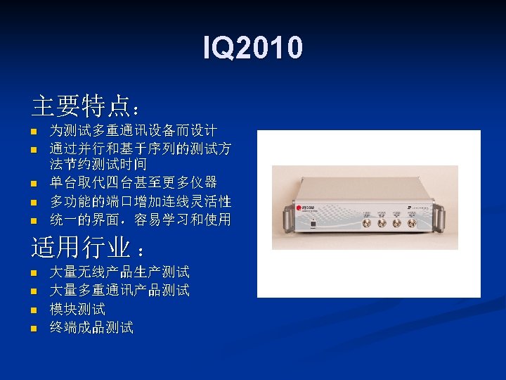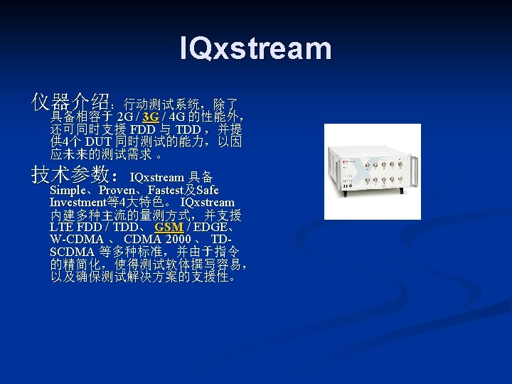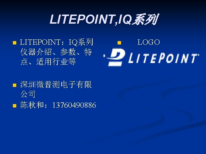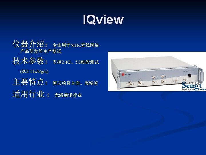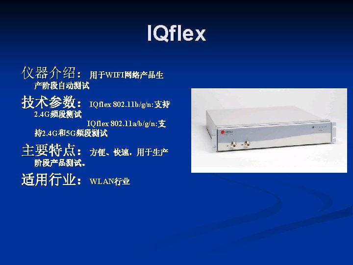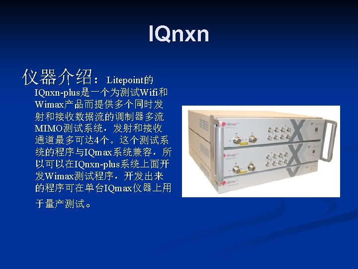 LITEPOINT IQview IQnxn IQflex LITEPOINT IQnav IQ 2010 Slides: 17 Download presentation LITEPOINT IQview IQnxn IQflex LITEPOINT IQnav IQ 2010 IQxstream 目录 一、IQview n 二、IQflex n 三、IQ 2010 n 四、IQnxn n 五、IQnav n 六、IQxstream n IQnxn 技术参数: n n n MIMO支持 Wimax: 802. 16 e-2005 / 无线MANOFDMA PHY、手机 Wimax“Wave 2”验证规范 Wifi MIMO: 802. 11 n、EWC、调制&编 码方案0 -32,20&40 MHz 模式 适用行业: n 无线通讯行业
