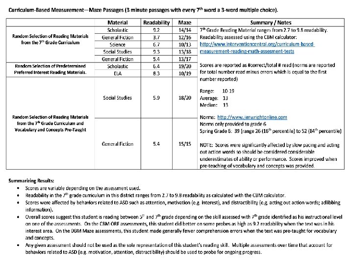 Steps to Create a Similar Profile Document • The CORE Reading Assessments • Steps to the CBM Assessments: – Get copy of the full year reading curriculum (ex. science, social studies, lit, etc. ) – Segment out student high interest text (e. g. topics or material (i. e. Scholastic)). – Randomly select passages from both the full year and the high interest text. – Type selected passages into the Intervention Central CBM calculator to determine readability: http: //www. interventioncentral. org/curriculumbased-measurement-reading-math-assesment-tests. – Create probes of the selected text for both Oral Reading Fluency (ORF) – 1 minute probes -- and Maze Passages (comprehension) – 3 minute probes– – Assess student periodically over the course of 2 -3 weeks using the CBM probes. – For some of the full reading curriculum passages, assess following preteaching of vocabulary and concepts (create background knowledge). – Compare results with the CBM norms provided by Hasbrouck & Tindal (2005) or your own state or local norms. – Summarize results and behaviors that may have impacted these results.