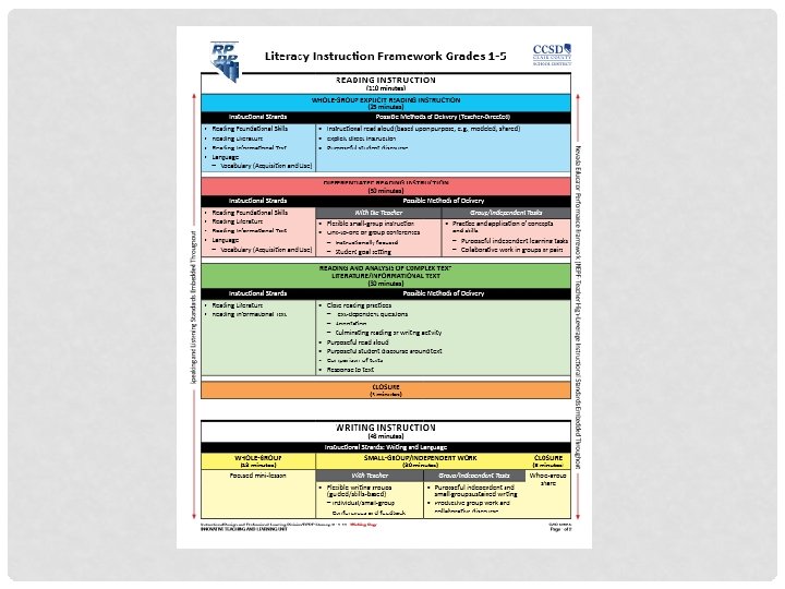 LITERACY INSTRUCTION FRAMEWORK GRADES 1 -5 WHOLE-GROUP EXPLICIT READING INSTRUCTION (25 MINUTES) DIFFERENTIATED READING INSTRUCTION (50 MINUTES) READING ANALYSIS OF COMPLEXT TEXT LITERATURE/INFORMATIONAL TEXT (30 MINUTES) CLOSURE (5 MINUTES) READING INSTRUCTION 110 MINUTES