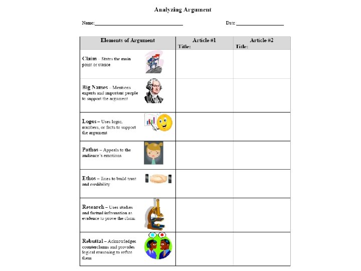 Argument vs. Persuasion • Argument: A reasoned, logical way of demonstrating that the writer’s position, belief, or conclusion is valid. (EVIDENCE is used to prove a point. ) • Persuasion: The author uses emotional appeal and/or the character or credentials of the author to persuade the reader to believe what they say.