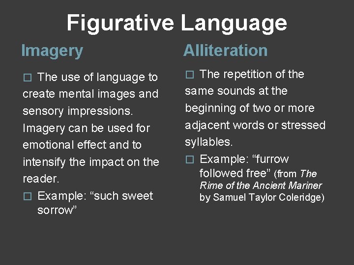 Figurative Language Imagery Alliteration The use of language to create mental images and sensory impressions. Imagery can be used for emotional effect and to intensify the impact on the reader. � Example: “such sweet sorrow” � � The repetition of the same sounds at the beginning of two or more adjacent words or stressed syllables. � Example: “furrow followed free” (from The Rime of the Ancient Mariner by Samuel Taylor Coleridge)