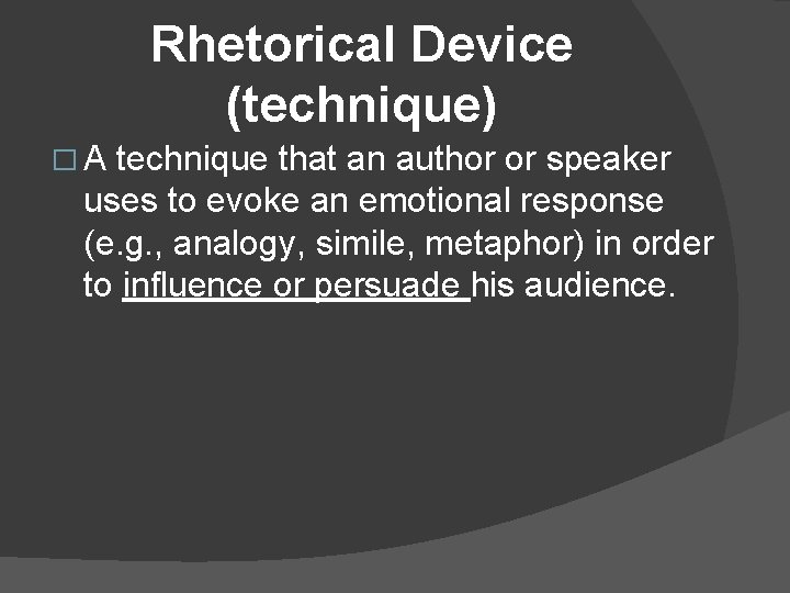 Rhetorical Device (technique) �A technique that an author or speaker uses to evoke an emotional response (e. g. , analogy, simile, metaphor) in order to influence or persuade his audience.