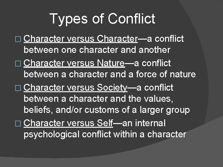 Types of Conflict � Character versus Character—a conflict between one character and another � Character versus Nature—a conflict between a character and a force of nature � Character versus Society—a conflict between a character and the values, beliefs, and/or customs of a larger group � Character versus Self—an internal psychological conflict within a character