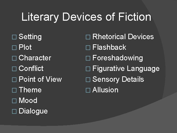 Literary Devices of Fiction � Setting � Rhetorical � Plot � Flashback � Character � Foreshadowing � Conflict � Figurative � Point of View � Theme � Mood � Dialogue Devices Language � Sensory Details � Allusion