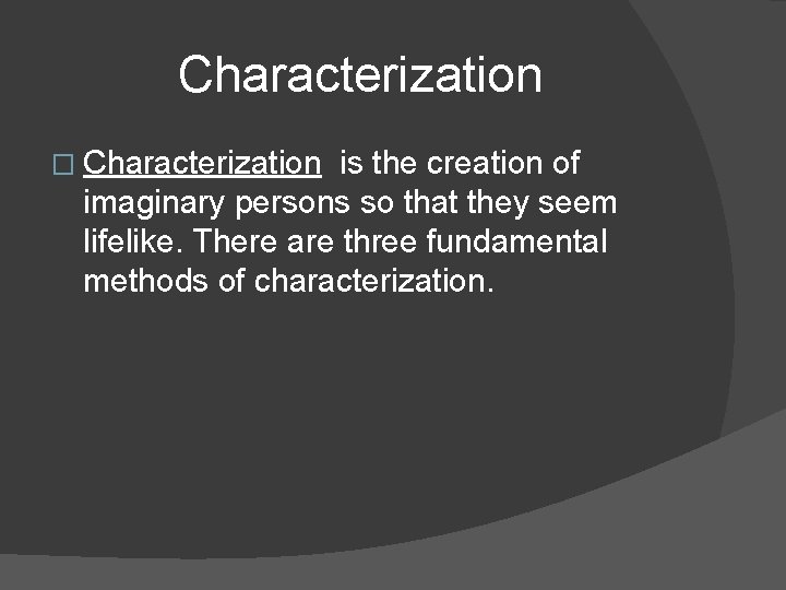 Characterization � Characterization is the creation of imaginary persons so that they seem lifelike. There are three fundamental methods of characterization.