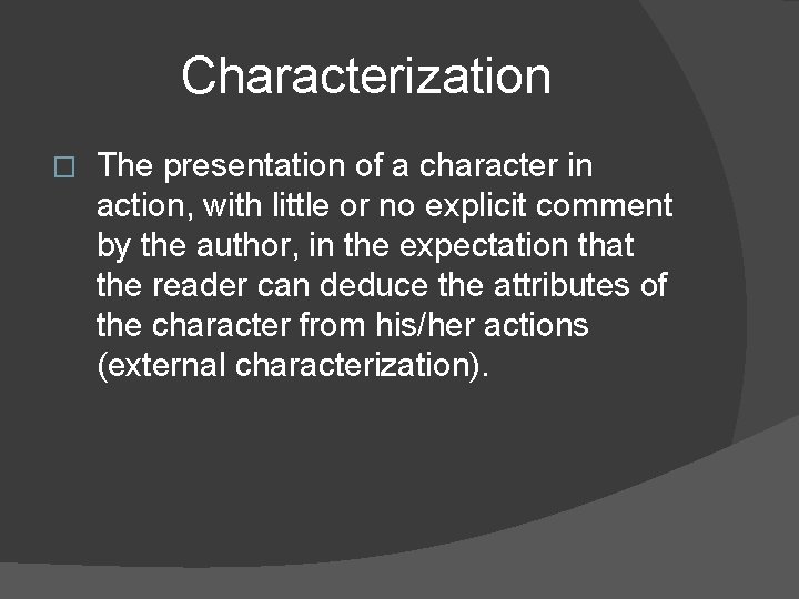Characterization � The presentation of a character in action, with little or no explicit comment by the author, in the expectation that the reader can deduce the attributes of the character from his/her actions (external characterization).